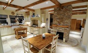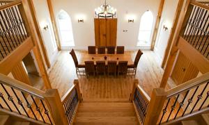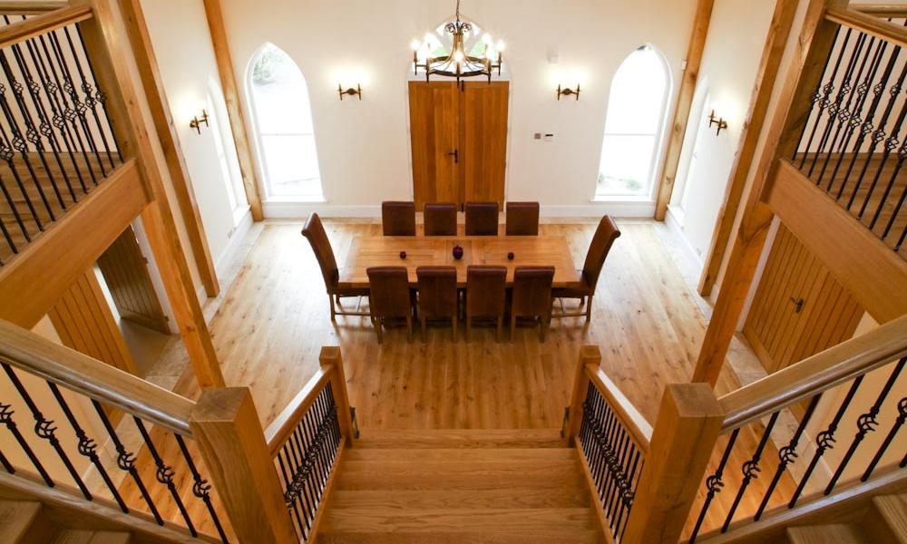Step under the archway entrance and you find yourself in a grand foyer with a magnificent bespoke oak staircase and an abundance of natural light flooding through the double-height ceiling windows and the four Gothic-style arch windows at ground level. The large dining room table and chairs provide a wonderful space for entertaining and an amazing first impression.